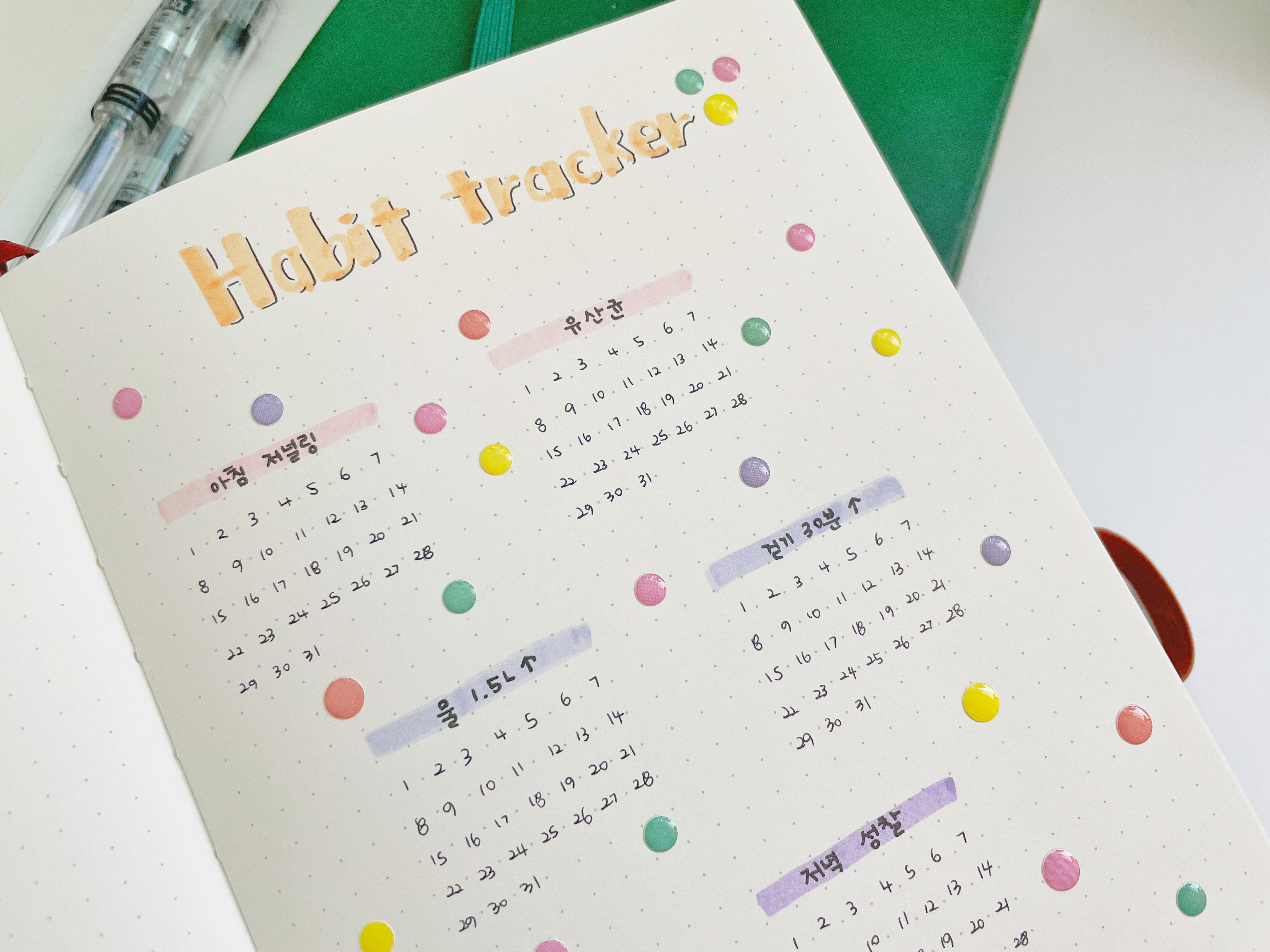 목표를 쪼개고 할 일이 정확히 정해졌다면 이제 불렛저널의 ‘해빗 트래커’를 활용하면 된다. 말 그대로 습관을 기록하고 추적하는 일인데 간단하게 먼슬리 로그의 일자 옆에 그 습관을 체크하며 사용할 수 있다. 혹은 한 페이지 통째로 컬렉션을 만들어 사용할 수도 있다. 이렇게 하면 가랑비에 옷 젖듯 나도 모르게 목표를 달성할 수 있다.