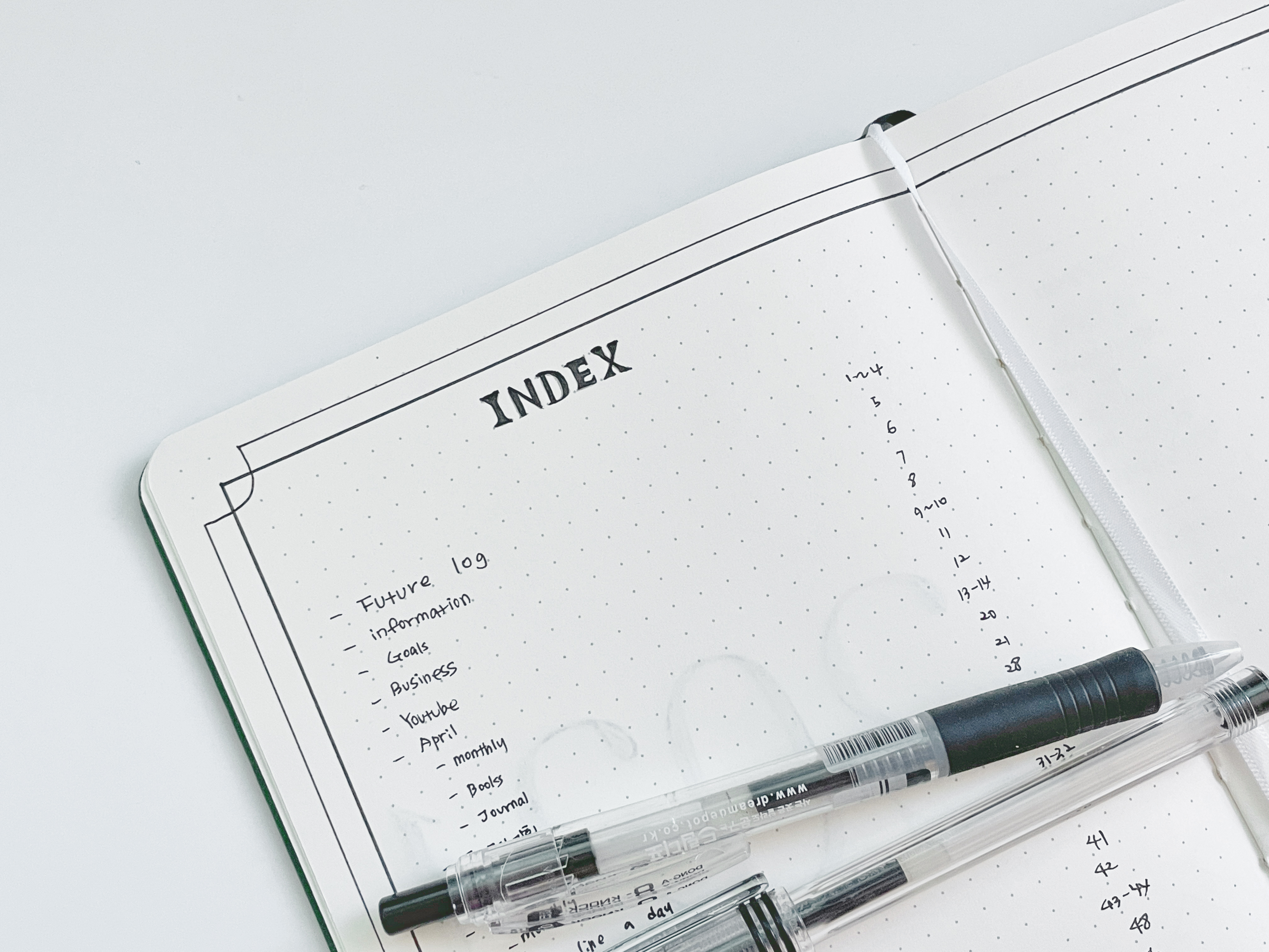 인덱스는 각각의 컬렉션들이 어디 있는지 표시해 주는데 이것은 넘버링을 통해서 가능하다. 인덱스가 아닌 모든 페이지에는 쪽수가 매겨지는데, 예를 들어 [새해 계획]이 7페이지에 쓰여있다면 아래 사진과 같이 [Goals - 7]를 인덱스에 표기해 주면 된다. 이렇게 해주면 어떤 메모가 어디 있는지 잘 찾을 수 있다.