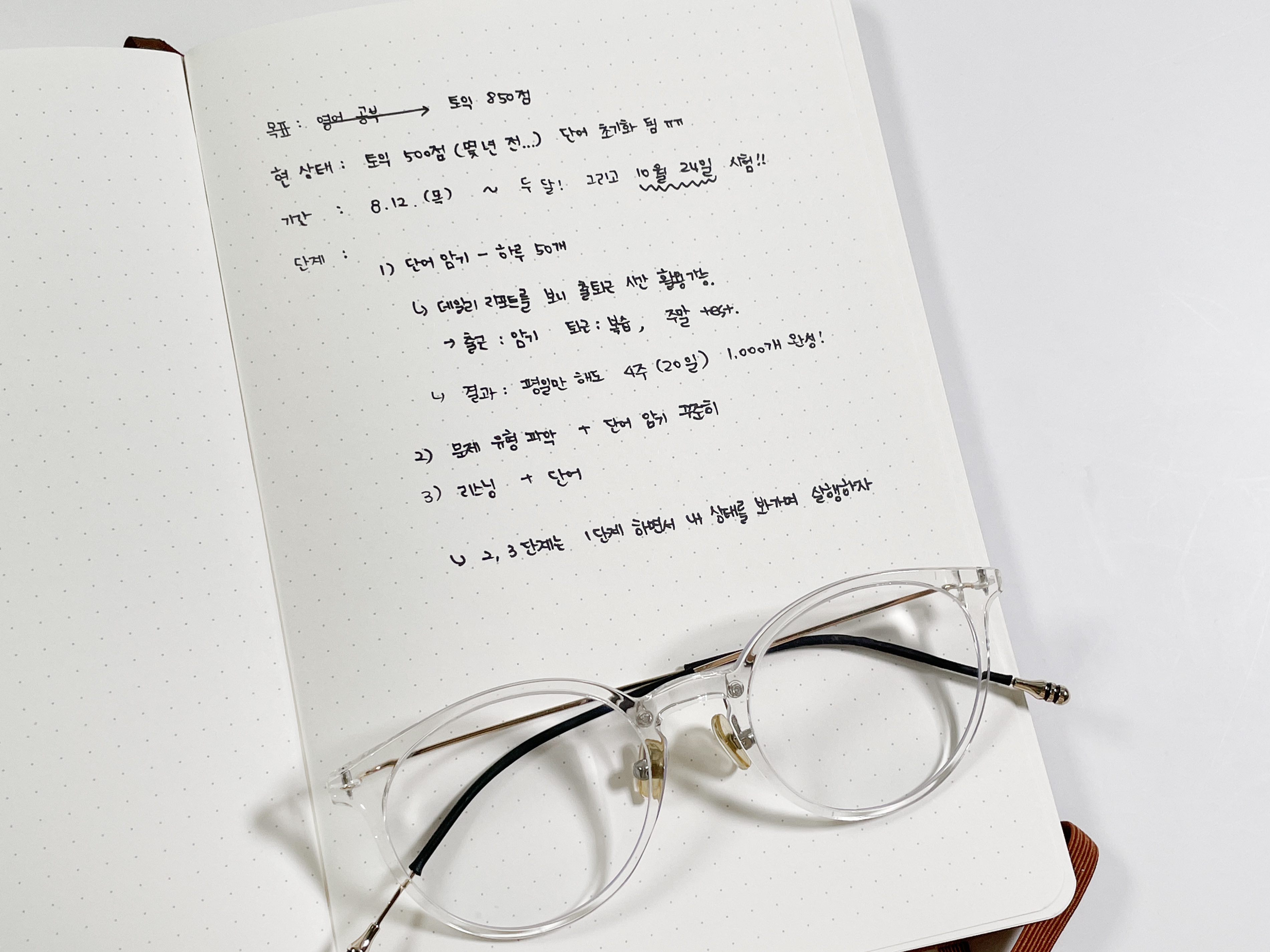 예를 들어 ‘영어 공부’가 목표였다면 그것을 정확한 도달점과 기간을 통해 정할 수 있다. ‘영어 공부’라는 막연한 계획을 ‘토익 850점’을 목표로 ‘두 달 동안’ 하기로 정하는 것이다. 그렇다면 앞으로 해야 할 작은 단계를 정하는 것 또한 더욱더 수월해진다.