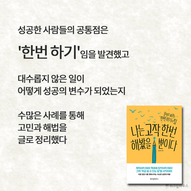 동기를 끌어올리기 위해서는 ‘해냈다’는 경험을 해보는 것이 중요하다. 그러기 위해서는 성공 확률이 높은 만만한 것을 잡아 ‘한번 하는 것’이 도움이 된다. 작은 것이라도 실천해서 ‘해내면’ 그 맛을 못 잊고 더 큰 걸 시도하려고 하기 때문이다. 그러면 동기부여는 자동이다. 이는 ‘선동기부여-후실천’과 정반대 순서의 전략으로, 별것 아닌 것 같지만 효과는 강력하다. 또 부수적으로 수많은 행운을 발생시킨다. - 「나는 고작 한번 해봤을 뿐이다」 중에서김민태PD는, 잘 짜인 계획이나 원대한 목표보다