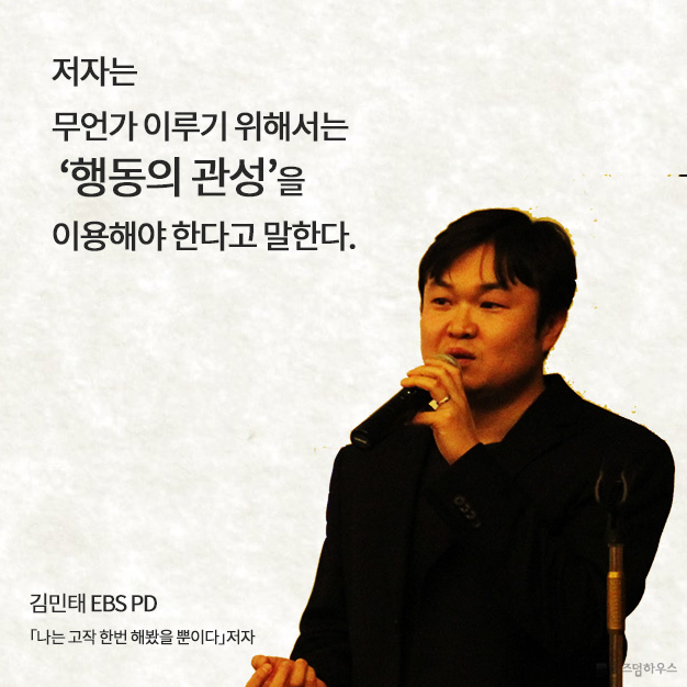 동기를 끌어올리기 위해서는 ‘해냈다’는 경험을 해보는 것이 중요하다. 그러기 위해서는 성공 확률이 높은 만만한 것을 잡아 ‘한번 하는 것’이 도움이 된다. 작은 것이라도 실천해서 ‘해내면’ 그 맛을 못 잊고 더 큰 걸 시도하려고 하기 때문이다. 그러면 동기부여는 자동이다. 이는 ‘선동기부여-후실천’과 정반대 순서의 전략으로, 별것 아닌 것 같지만 효과는 강력하다. 또 부수적으로 수많은 행운을 발생시킨다. - 「나는 고작 한번 해봤을 뿐이다」 중에서김민태PD는, 잘 짜인 계획이나 원대한 목표보다