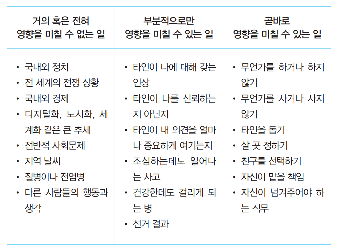 다음 표를 자세히 보자. 지금 내가 원하는 일이 대체로 첫 번째와 두 번째 열에 들어간다면, 즉 내 힘으로 어쩔 수 없는 일에 주로 몰두한다면 제정신으로 살아가기 버거울 것이다.