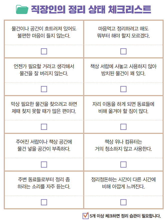 그렇다면 나의 정리 상태는 어떨까? 필요한 물품이나 자료를 찾으려면 폴더마다 열어봐야 하지 않는가? 내가 원하는 것을 제때 찾지 못하면 실수는 잦아질 수밖에 없고, 그 모습은 '정리를 못하는 사람'이라는 이미지를 심어줄 수밖에 없다. 아래의 간단한 테스트를 통해 나의 정리 상태를 체크해보자.
