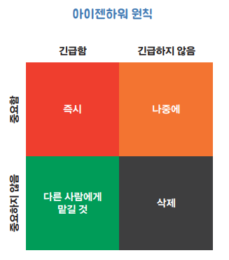 그러나 아이젠하워 원칙을 그렇게 단편적으로만 파악할 것은 아니고, 어떤 원리로 일을 나누었고 왜 직접 처리하지 않고 다른 사람에게 일을 맡겼는지 그 이유를 알 수 있다면, 우리 상황에 맞게 충분히 변형해서 적용할 수 있을 것이다.
