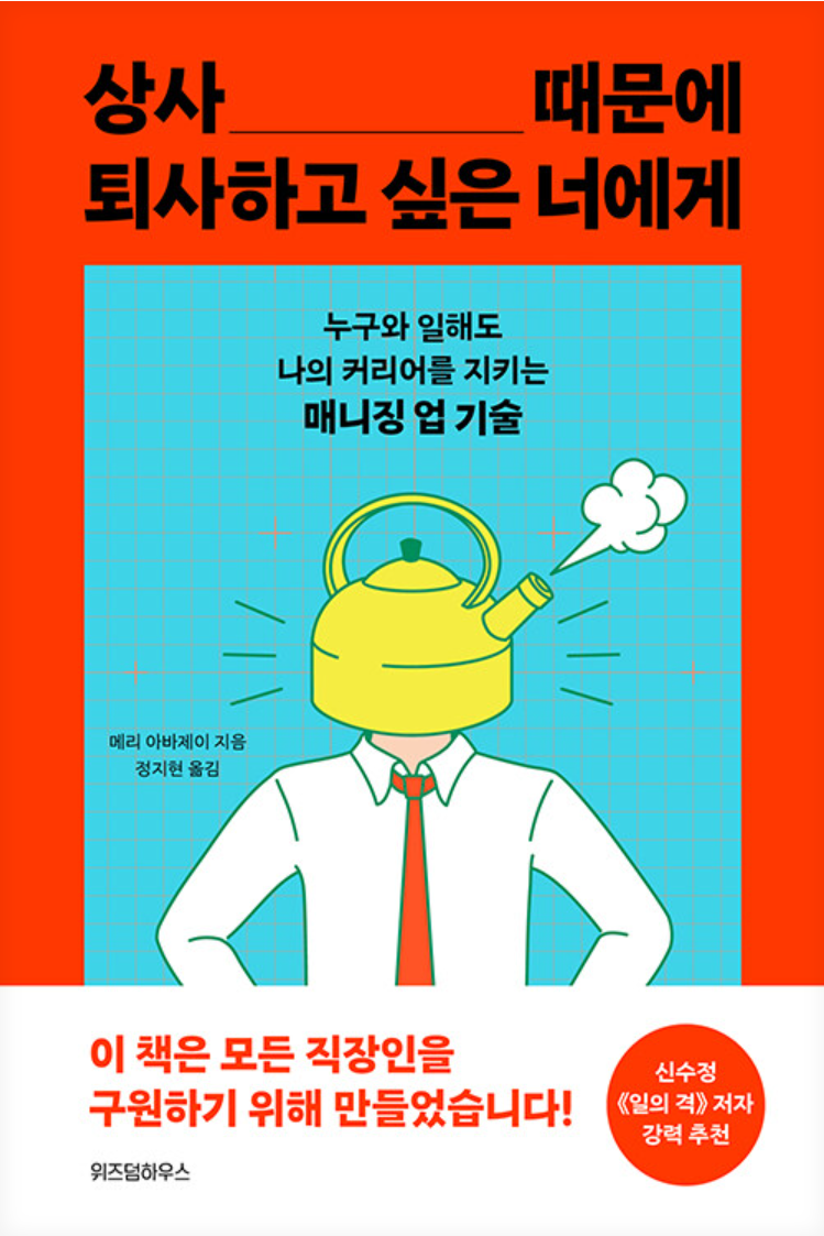 Copyright 2023. 메리 아바제이 All rights reserved. / 본 사이트에 게재된 콘텐츠는 (주)위즈덤하우스 에서 관리하고 저작권법에 따라 보호되는 저작물입니다. 사전 동의 없는 무단 재배포, 재편집, 도용 및 사용을 금합니다. 해당 글은 <상사 때문에 퇴사하고 싶은 너에게>에서 발췌, 재편집하였습니다.