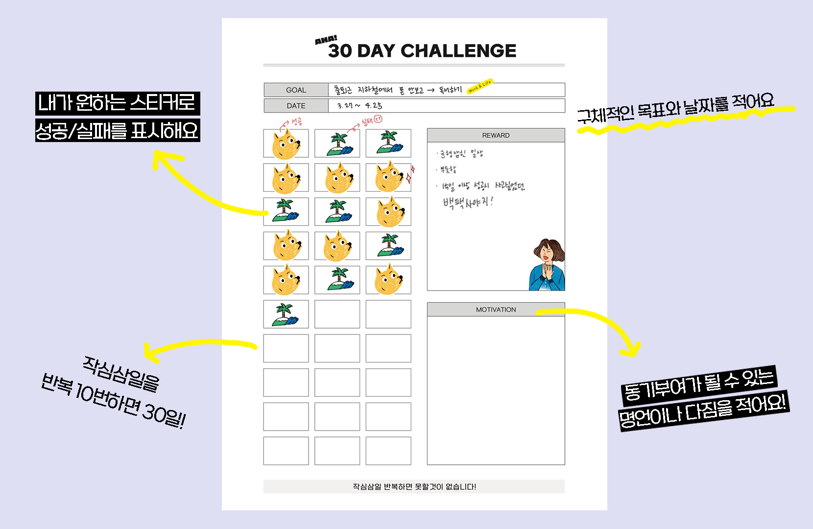 상단에 30일 동안 도전해 보고 싶은 목표와 날짜를 적어요. 오른쪽 칸엔 내가 이 목표를 끝냈을 때 스스로에게 줄 수 있는 리워드를 적어봅시다. 리워드는 작아도 구체적이면 구체적일수록 좋아요! 아래에는 동기 부여가 되는 문장 등을 적어둘 수 있어요. 슈가슈가의 원픽 문장은 '작심삼일 반복하면 못할것이 없습니다!'