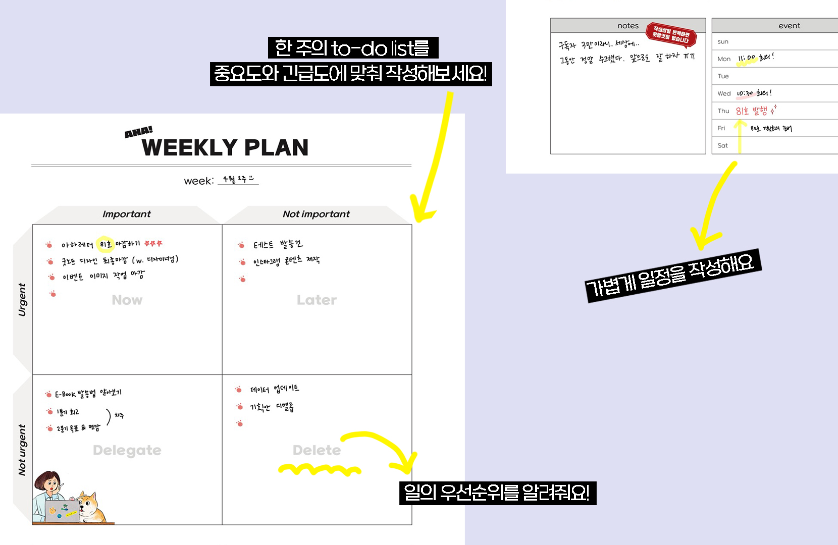 위클리 플랜을 색다르게 구성해 봤어요. 『일 잘하는 사람의 시간은 다르게 흘러간다』에 소개된, 시간 관리의 정석 '아이젠하워' 방법을 활용한 표를 넣어보았는데요, 한 주의 일정을 중요도와 / 긴급도로 나눠 진행해 보세요.