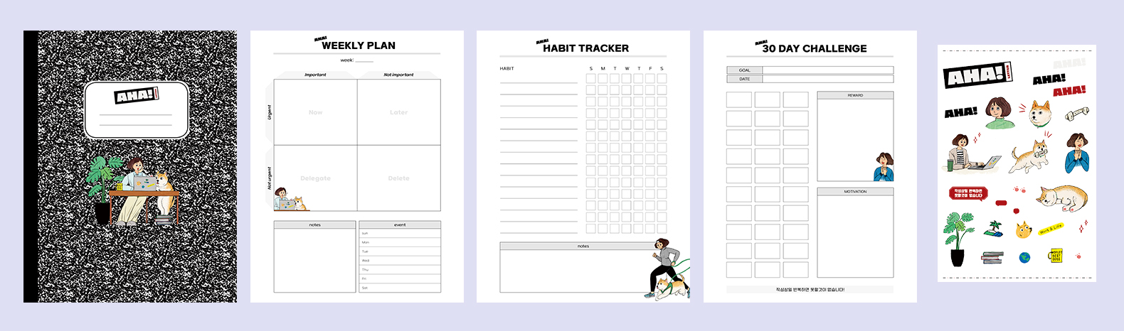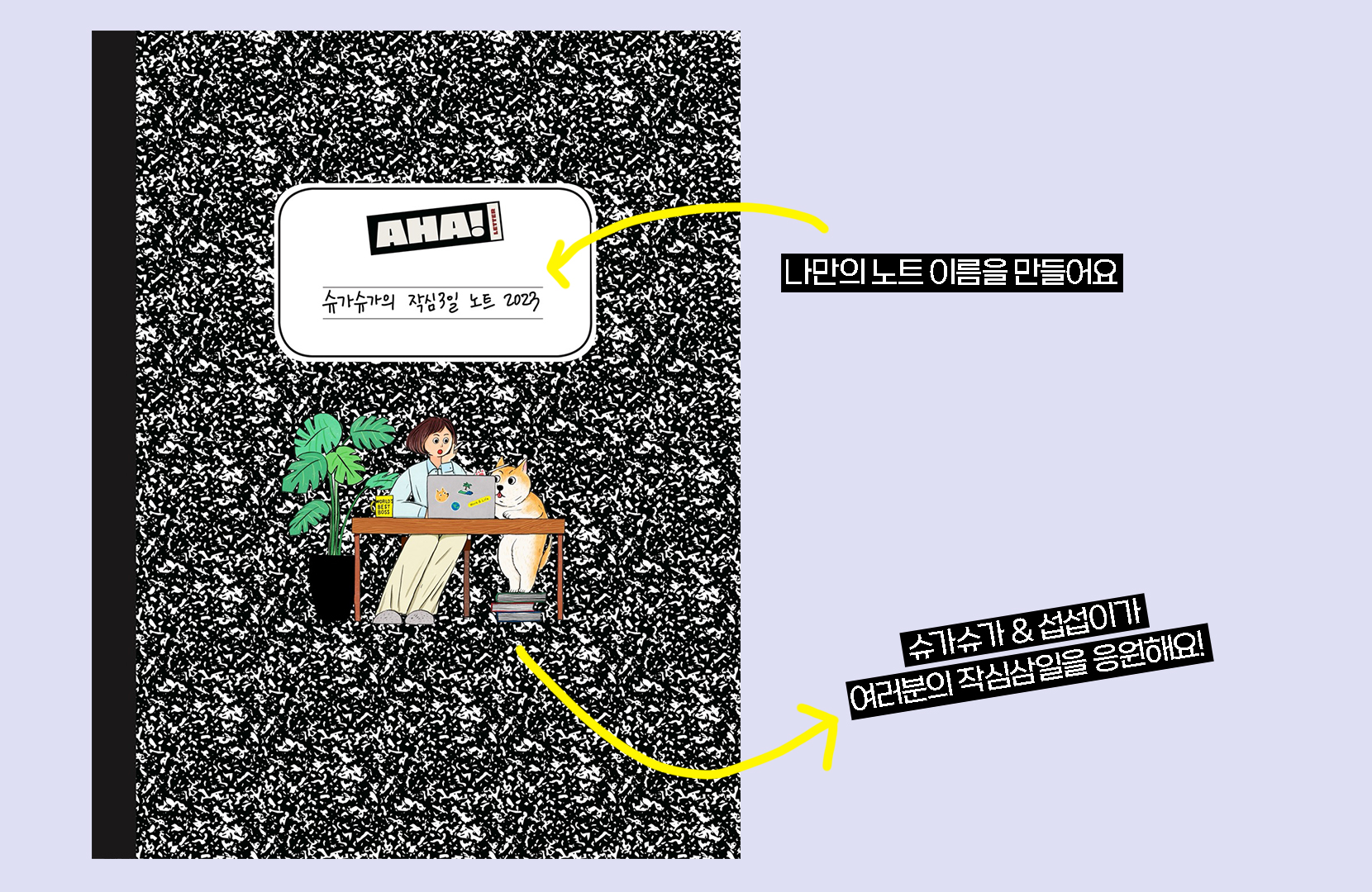 깔끔한 검정 마블 패턴으로 표지를 만들었어요. 아하 모먼트 가득한 노트가 되기를 바라며 AHA! 를 넣었고, 여러분의 작심삼일을 함께 응원하고 싶어서 열공하고 있는 슈가슈가 & 섭섭이를 넣었어요. 여러 스티커들로 표지를 자유롭게 꾸밀 수 있어요!