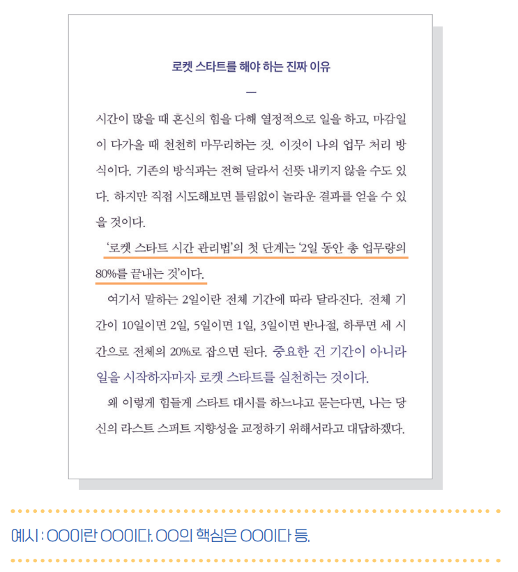 책을 읽다가 중요한 부분에 밑줄을 그어야 한다. 여기서 말하는 ‘중요한 부분’이란 무엇일까? 저자가 중요하게 여기는 핵심이 아니라 ‘내 문제해결의 실마리’에 해당하는 부분, 즉 나에게 중요한 부분이다. 예를 들어 나에게 '오전에 업무의 50% 이상을 처리하고, 정시에 퇴근하려면 어떻게 해야 하는가?'라는 핵심 문제가 있다. 이 기준으로 나키지마 사토시의 《오늘, 또 일을 미루고 말았다》를 읽으며, What / How / Why 3가지에 집중해서 함께 밑줄을 그어보자.