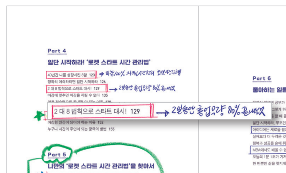 이런 식의 코어리딩을 하면 이후 자신이 정리한 목차만 봐도 핵심 내용이 바로 떠오른다. 내 사고를 거쳐 나만의 언어로 적었기 때문이다. 이렇게 하면 ‘①밑줄 긋기 ⇨ ②아이디어 도출 ⇨ ③나만의 목차 작성’까지 핵심 읽기 한 세트가 끝난다. 이런 방식으로 다음 목차를 반복한다.