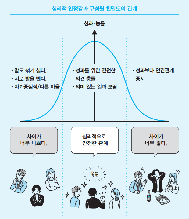 심리적 안정감은 단순히 팀원의 사이가 좋은 것을 뜻하지 않는다. 사이가 너무 좋은 나머지 현재의 인간관계 유지를 우선해서 할 말을 제대로 하지 못한다면 성과는 오르지 않는다. 심리적 안정감이 높은 팀이란, 사이가 너무 나쁘지도 좋지도 않으면서 목표나 성과를 위해 건전한 의견 충돌을 일으키는 팀이다.