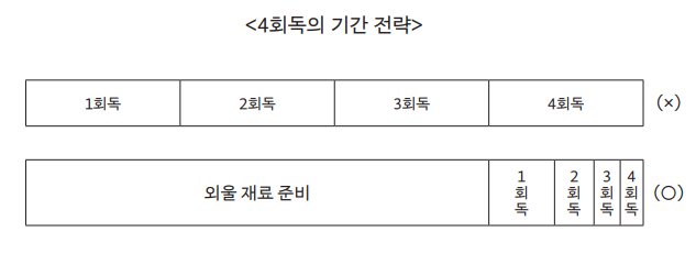 여기서 말하는 4회독은 오로지 ‘암기’하는 기간만을 의미한다. 강의를 ‘듣고’, 문제집을 ‘풀고’, 복습하면서 노트를 한 번 ‘정리’하고 등의 과정은 포함되지 않는다. 그것은 시험 기간에 외울 내용을 만드는 과정에 속한다. 많은 수험생이 강의를 한 번 들으면, 문제집을 한 번 풀면, 노트 정리를 한 번 하면 1회독을 했다고 착각하는데 그것은 절대 1회독이 될 수 없다. 외운 적이 없기 때문이다. ‘그저 암기만’ 하는 것이 회독의 시작이다.