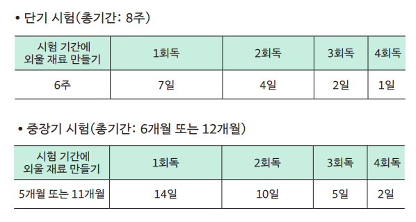 시험마다 준비 기간이 다르니 단기와 중장기로 나눠서 살펴보자. 단기 시험은 중간고사나 기말고사같이 두 달 정도 만에 치르는 시험, 중장기 시험은 최소 6개월에서 1년에 한 번씩 보는 시험을 말한다.