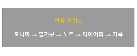 2021년 지퀀스(Zequenz)라는 해외 고급 다이어리 브랜드의 한국 런칭을 앞두고 단어 연상법으로 브랜딩 전략을 위해 키워드를 도출해보았다. 우선 모나미와 다이어리에서 연상되는 포괄적인 단어나 문구를 찾고, 그와 연관된 단어를 이어나갔다.