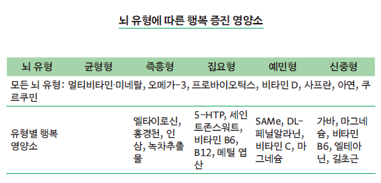 뇌 유형 식단 유형 행복한 음식 균형형 균형 잡힌 식사 프로바이오틱스가 풍부한 식품: 소금에 절인 채소, 김치, 사워크라우트, 케피르(무설탕), 된장국, 피클, 스피룰리나spirulina(남조류에 속하는 나선형 미생물), 클로렐라, 콤부차(저당) 즉흥형 고단백 저탄수화물 식사 집중력과 동기부여를 돕는 도파민이 풍부한 식품: 강황, 녹차, 렌틸콩, 생선, 양고기, 닭고기, 칠면조, 쇠고기, 달걀, 견과류와 씨앗류, 고단백 채소(브로콜리, 시금치 등), 단백질 분말 집요형 복합탄수화물 비율이 높고 단백질 비율이 낮은 식사 세로토닌이 풍부한 식품: 트립토판을 함유한 식품(달걀, 칠면조, 해산물, 병아리콩, 견과류, 씨앗류)과 고구마, 퀴노아처럼 몸에 좋은 탄수화물을 함께 섭취해 인슐린이 뇌로 가도록 돕자. 예민형 균형 잡힌 식사 엔도르핀 분비를 자극하는 식품: 매운 음식(할라페뇨, 하바네로, 칠리 같은 고추)과 다크 초콜릿 신중형 균형 잡힌 식사 비타민 B6가 풍부한 식품: 시금치, 마늘, 브로콜리, 방울양배추, 바나나