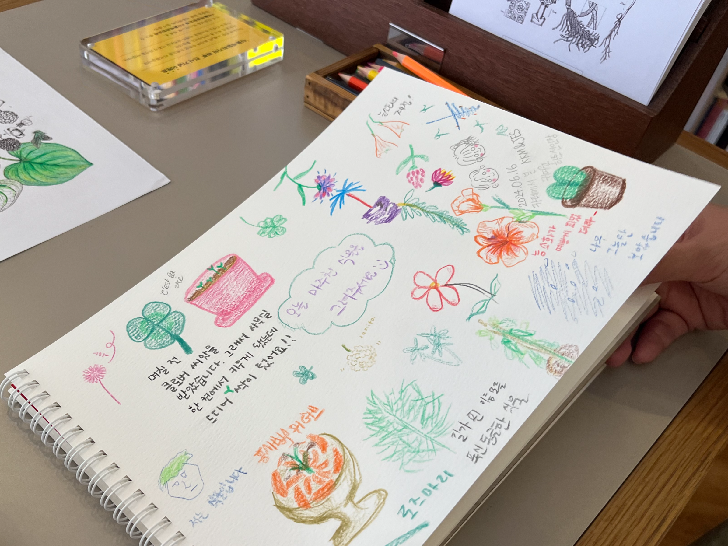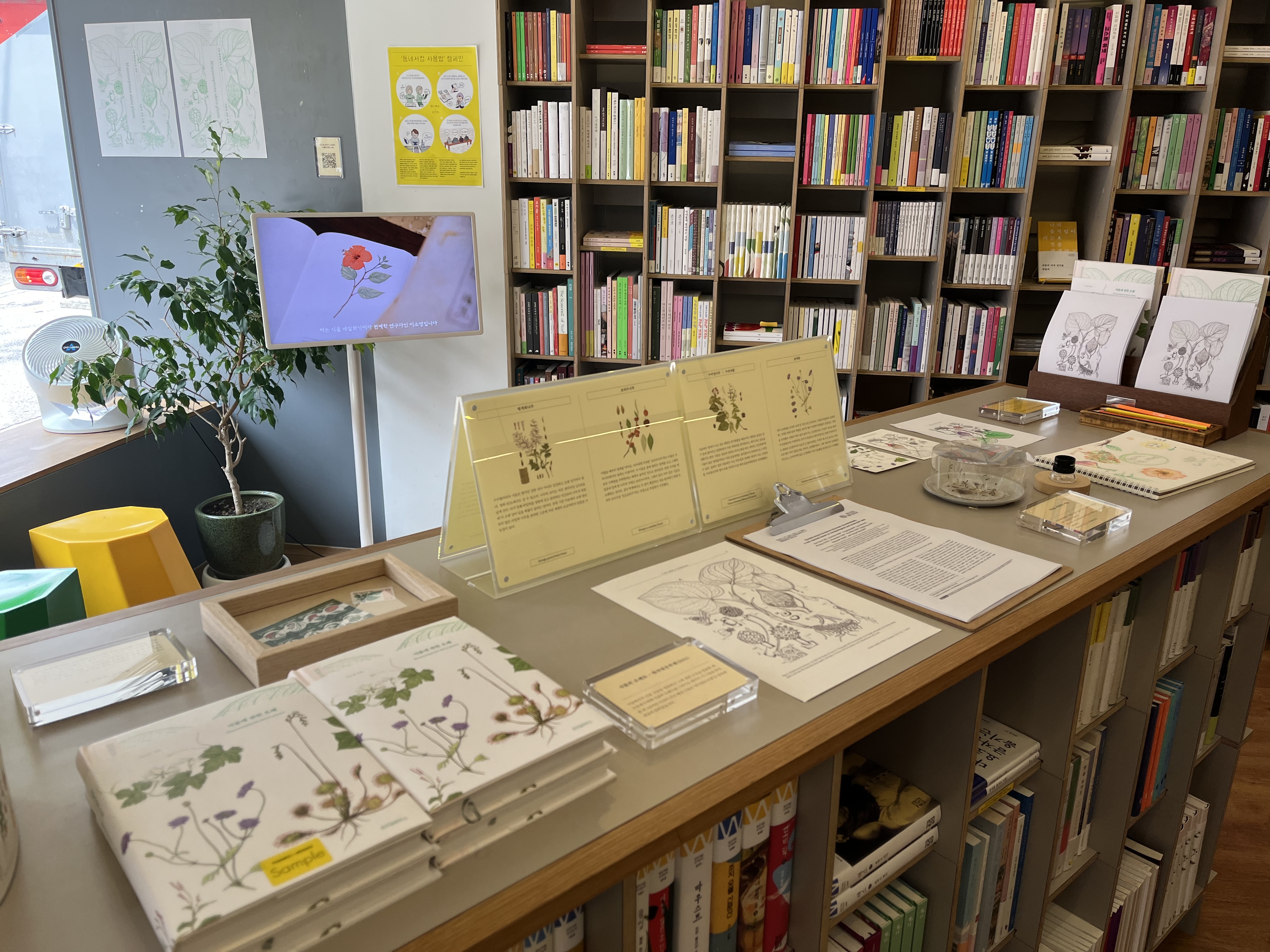 평일 낮이라 그런지 책방 안은 여유로웠다. 내부에는 별도의 테이블에서 더 많은 정보를 보고 색칠공부처럼 직접 식물세밀화를 체험해 볼 수 있었다. 신기한 식물 우표, 서적과 자료 등 이소영 식물세밀화가의 영감과 결과물, 물건들도 볼 수 있다. 그곳엔 그동안 다녀간 분들이 직접 그린 식물 그림 스케치북이 있었는데, 다들 얼마나 다채롭게 잘 그리셨던지! :) 그 옆에 루페로는 처음에는 씨앗이었던 식물이 자란 모습을 한참 들여봤다. 책방 한쪽에서 이소영 작가의 따뜻한 목소리가 담긴 아름다운 영상도 감상할 수 있다.