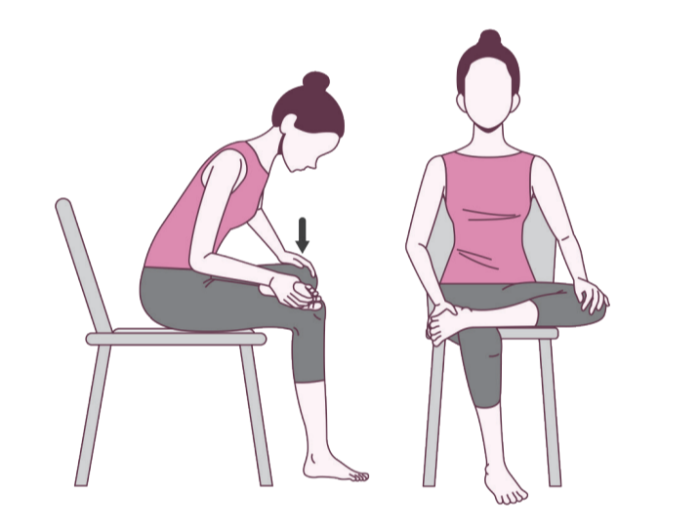 ② 한쪽 다리를 구부려 반대쪽 허벅지에 올려놓고 손으로 무릎을 눌러준다.