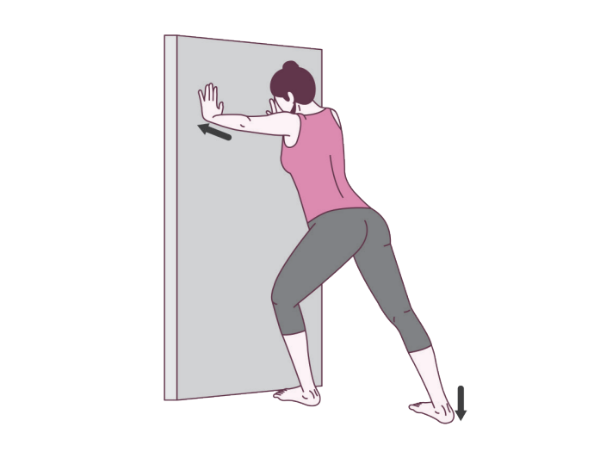 ③ 뒷다리는 무릎을 핀 상태로 뒤꿈치를 땅에 눌러주면서 벽을 조금씩 민다.