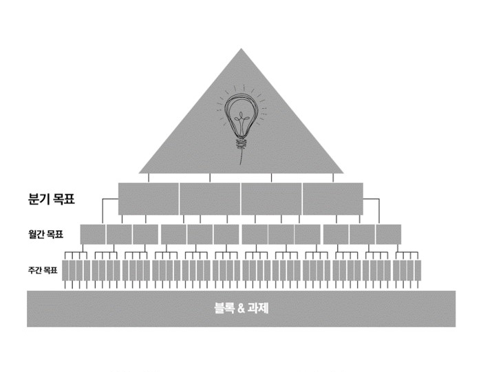 따라서 어떤 목표가 생기면 일단 계획을 10단계로 쪼개서 설정한다. 목표 당 최소 10등분 한 계획을 세우면 10등분이 진도가 되는 것이다. 더 나아가서는 00등분한 게획들을 그룹핑 하거나 우선순위를 매길 수도 있고 내 계획의 진척 상황을 퍼센트로 표현할 수 있는 것이다. 혹 20, 30등분으로 더 잘게 쪼갠 계획을 세우는 것은 위험한데, 이렇게 되면 도전하기 않거나 아예 안하게 될 수 있다.그리고 아래 두 가지를 피하면 훌륭한 계획 세우기가 가능하다