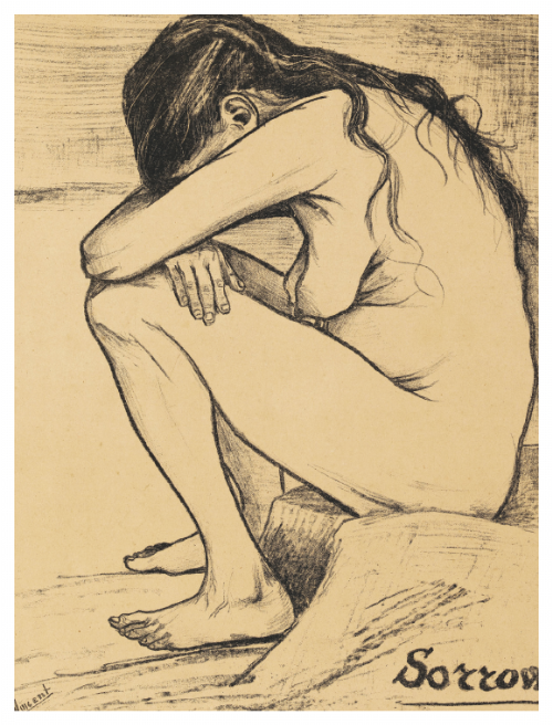 〈슬픔〉 1882년, 연필 스케치, 44.5×27cm. 1885년 4월 말에 〈감자 먹는 사람들〉을 그렸다. 이것은 그가 처음 시도해보는 대규모 구성 작품이었다. 이 그림은 어두운 색조를 띠고 있는데, 그 후로 밝은 색채의 필요성을 느끼게 되었다.