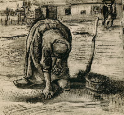 〈감자를 심는 농부 여인〉 1885년, 종이에 지우개와 바니시, 검은색 분필과 목탄, 41.7×45.3cm. ✅ 출처: 반 고흐, 영혼의 편지 & 반 고흐, 영원한 예술의 시작
