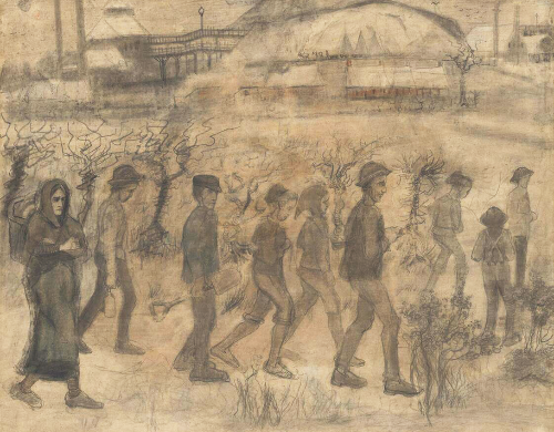 〈눈 속의 광부들〉 1880년, 그물 무늬 종이에 연필과 색분필과 투명 수채, 44.5×54cm. 크고 작은 고충은 수수께끼 같다. 힘들더라도 해답을 찾으려 노력할 만한 가치가 있다.