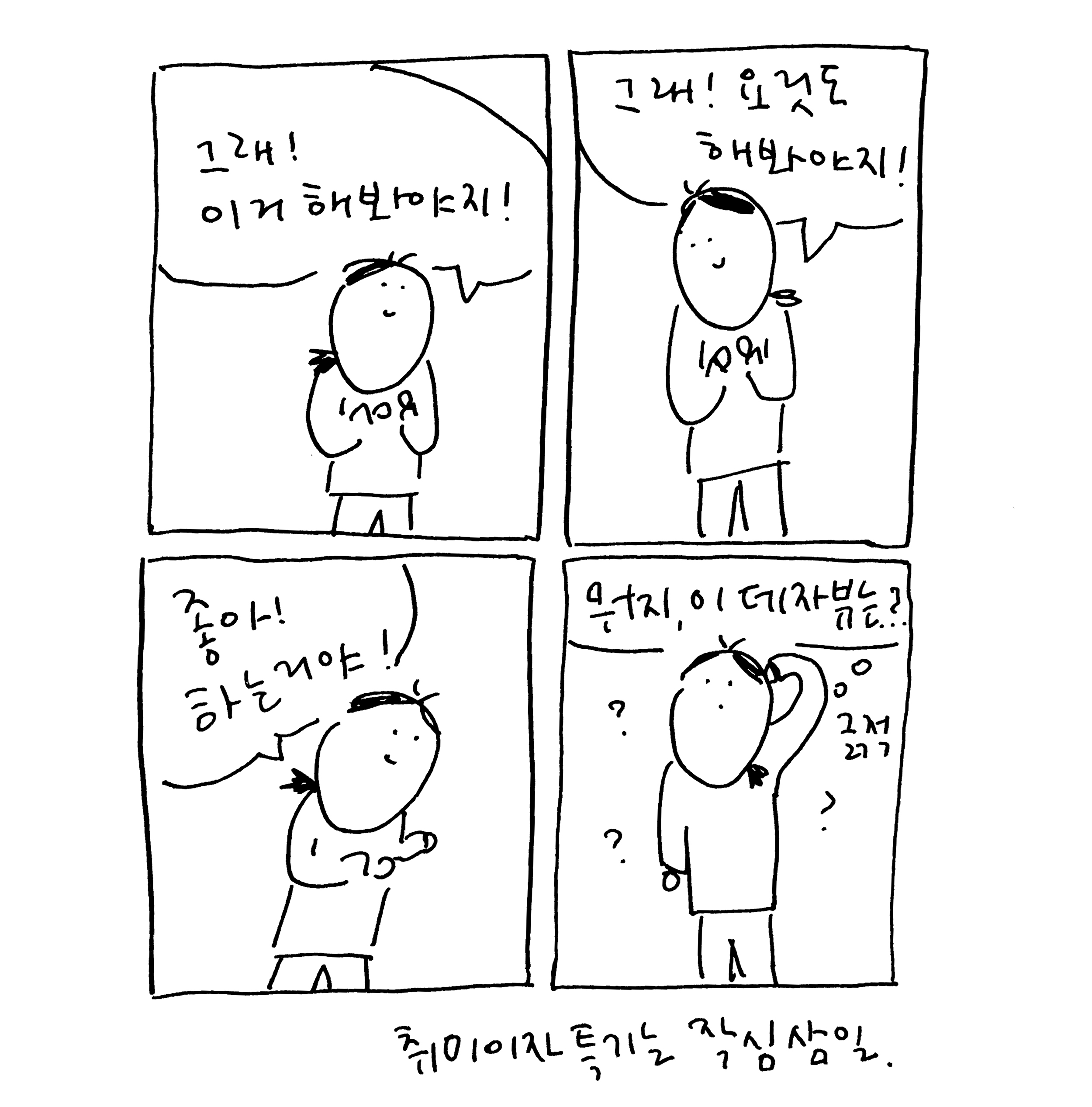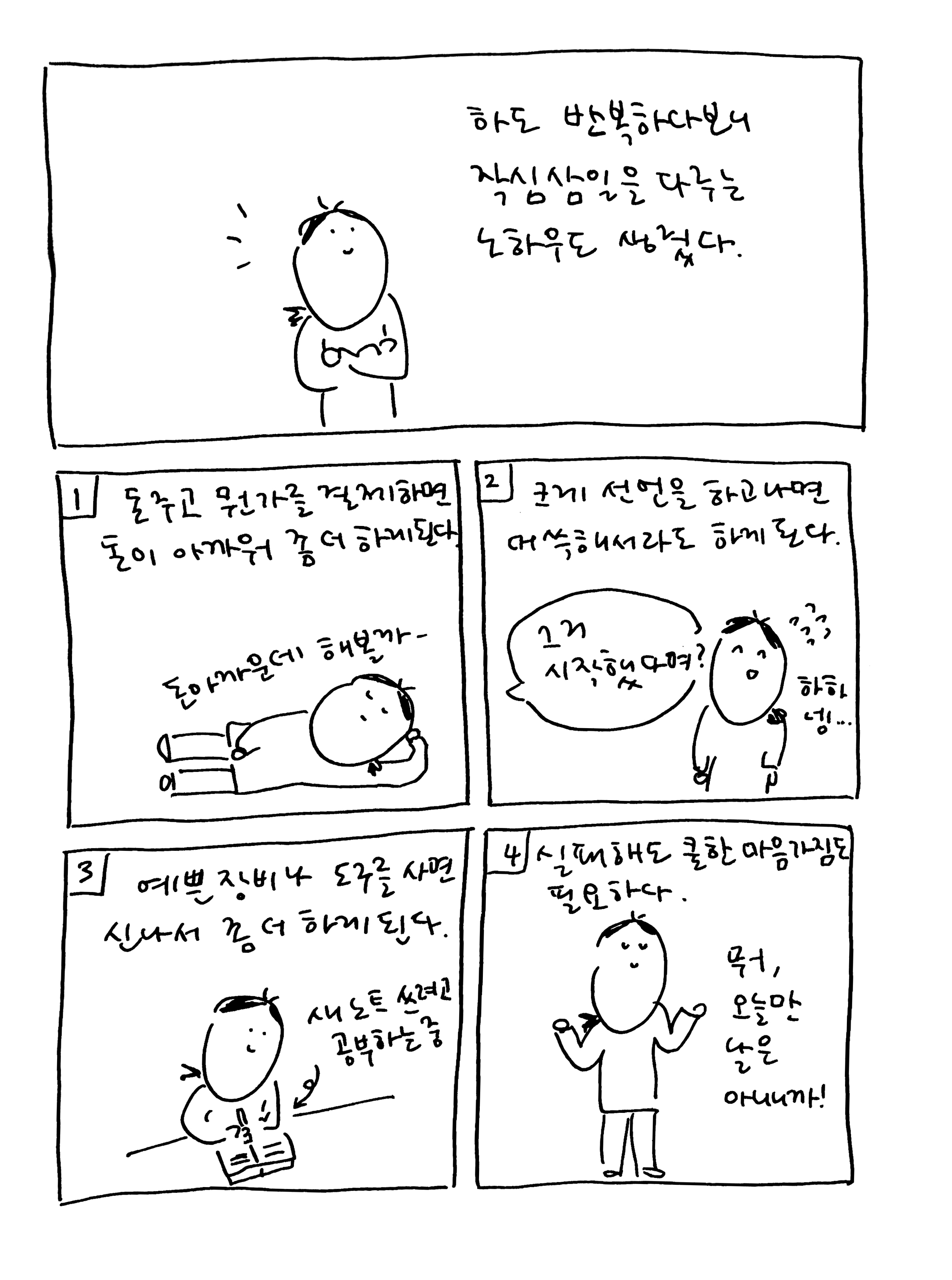 '작심삼일'이란 단어를 해체해보면 작심(作心), 즉 굳게 먹은 마음이 3일 안에 끝나버린다는 뜻이다. 굳이 변명하자면 마음을 자주 먹으니, 그 수에 비례해 포기 사례도 많을 수밖에 없다. 그러니 작심삼일은 다짐이 취미인 나의 삶과 떼려야 뗄 수 없는 것이다.돌이켜보면 나의 작심삼일의 역사는 꽤나 길다. 학창 시절에도 다짐형 학생이었던 나는 시작한 것을 끈질기게 끌고 가는 뒷심이 약해 무엇이든 쉽게 그만두곤 했다. 대신 앞심(?)은 누구보다도 강해서 무엇이든 화이팅 넘치게 시작했는데, 상상 속에서 열심히 계획을 세우고, 열정이 앞서 준비물부터 한가득 구매하고, 그 후 며칠간은 정말이지 밤샘을 자처해가며 불태우는 식이었다. 누가 봐도 '이러다 진로도 이쪽으로 가겠는걸?'이라고 오해할 정도로 깊게 빠져드는 듯 싶다가도 얼마 못 가 급격하게 흥미가 떨어져 그만둬버리기 일쑤였다. 새로운 과목이든, 장소든, 악기든, 심지어 아이돌 덕질마저도 초반에 하얗게 불태우고 이내 열정이 사그라드는 삼일천하는 장르를 불문하고 계속됐다.